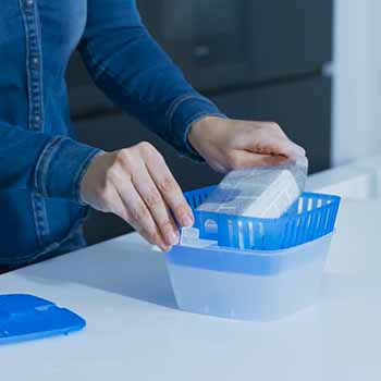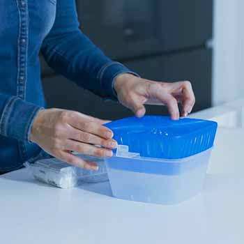 Retire a tampa do dispositivo e coloque o saco ou o íman no recipiente. Atenção: certifique-se de que o saco fica completamente encaixado no dispositivo. Recoloque a tampa e o desumidificador está pronto para uso. Coloque o dispositivo em uma superfície sólida e estável. O desumidificador é fácil de esvaziar, assim que o sal esteja completamente dissolvido. Reabasteça com uma nova recarga.